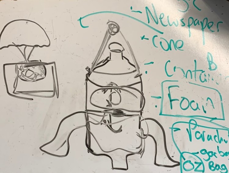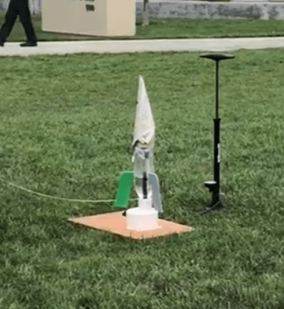 To begin, we did not immediately go to building. What we first did was go to the drawing board. We drew all the key components of the rocket such as the parachute, wings, and nose cone and talked about how we would protect the egg and make the bottle separate. After agreeing on an initial design, we then started building. We used 2 Pepsi bottles which fit on the launcher nicely. We also put a lot of focus on the safety of the egg. We used packaging foam as a first layer to wrap around the egg, then we wrapped the egg around egg carton foam. We also put cotton balls to fill the gap between the tip of the bottle and the safety mechanism. With all the safety mechanisms packaged in, we put the parachute over that so it would be able to deploy. We used the hole puncher to put holes in the bottle and in the garbage bag we used as our parachute. We used string the attach the parachute. We made the string very short so that it would deploy quickly and be less likely to get tangled. Instead of tying the string, we used a hot glue gun to attach the ends of the string together. We built a nose cone out of newspaper originally and the construction paper, but for our final launch we did not use one (see results section for reason). When we were using the nose cone, we attached it to the bottle with tape. For the wings, we first used 3D printed wings, but they were very large and heavy, so we switched to laser cut foam wings. We attached the wings to the bottle with the hot glue gun. For the two halves of the bottle, the only thing keeping the two halves of the bottle together was friction, and we would place the top half of the bottle very loosely on the bottom half so it would come off easier, and we put the parachute hanging out a little bit so it would deploy. For our final launch, we used a water amount of about ⅓ to ⅜ of the bottle. We all had to use a psi of around 40.