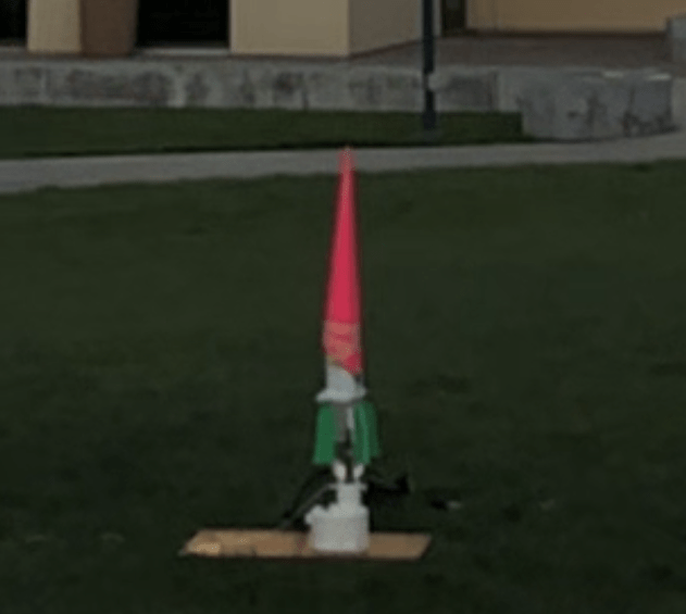 In this part we are going to talk about the changes we made throughout the process to our final launch. Preliminary, we said we were going to have the egg separate in its own compartment and have the parachute only attached to that part, rather than have the egg in the top half of the bottle. However, we then changed it so that the egg would go into the second half of the bottle. At first, we wrapped the egg around packaging foam, put that in a small container, then wrapped the container around “egg carton” foam, and then put all of that in a big sandwich bag to keep it snug. We then put even more packaging foam to fill the gap between the bag and the tip of the bottle. After doing many test runs we realized we were getting the separation and deployment, but that we were not getting a desired height. We realized that the egg was indeed very protected, but it also had a lot of weight. So, we took out the extra packaging foam, the small container, the sandwich bag, and just used a little bit of packaging foam and the egg carton foam. Also, at first we were using a small bag for our parachute, and we decided it was not giving us the slowing down of speed we wanted. Because of this, we changed to using a garbage bag as our parachute. A problem with this however was that due to the size of the parachute would not deploy if we stuck it all the way in the bottle, so we would leave a little hanging out to make it deploy. When we tested this out, it worked very nicely. Another change we made was that at first we used 3D printed wings, but they were very large and heavy, and greatly decreased the height the rocket could potentially reach. Because of this, we switched to laser cut foam wings which greatly decreased the weight of the rocket and even fulfilled the purpose of wings better. The last change we made to the rocket itself was the use of a nose cone. We tested out a nose cone twice, and both times the rocket would veer off diagonally because we could not get the nose cone straight. After doing test runs without a nose cone, we decided that the bottle could go high enough without the nose cone and that the nose cone was just even more unnecessary weight. One other change we made was the amount of water we used. We explored the usage of ½ half of water to ¼ of water. What we found was that with ½ the rocket did not get high enough, but with 1/4 , the rocket flew crazily, not straight. We found that between ⅓ to ⅜ was a good amount of water.