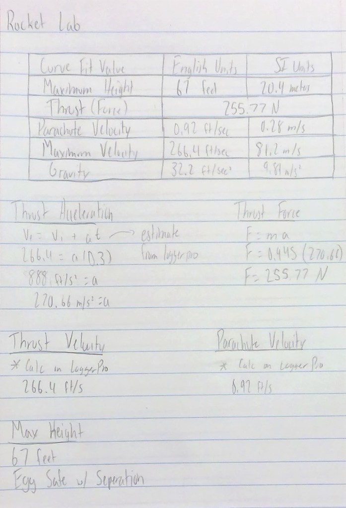 Now, we will talk about the performance of our rocket during the final launch. Looking even at our best launch, we still did not meet all of the highest requirements. We had separation and deployment of the parachute, and our egg was ok, but we only reached a height of 67 feet, instead of the desired 75 feet. With our second launch, once again we had separation and deployment, and the egg was ok, but we only reached a height of 59 feet. We hypothesized that the reason it went so low is because we put the top half of the bottle loosely on the second half of the bottle with the parachute sticking out to make it easier to deploy, and because of this the two halves were separating too early and not reaching their maximum potential height. For our third launch, we decided to put the parachute more in the top half and have less hanging out, and we put the top half on tighter. This led to a height of 123 feet, but we had no separation. Looking at the results of other classmates, only 4 groups met all of the highest requirements of 75 feet with separation, deployment, and the egg being ok. Also, the highest height recorded was 142 feet, but with no separation or deployment. A trend I notice throughout the results was for the groups that did not get all the highest requirements, they had similar issues to ours. They either did not get 75 feet but had separation and deployment with a protected egg, or they got over 75 feet with either no separation, deployment, and/or a broken egg. What was unique about our group is that we had the lightest rocket of 945 grams, or 0.945 kilograms. Hypothetically, you could see this as meaning we could have gotten the highest height because we had the least weight, but it could also mean we didn’t have enough ballast weight causing us to not go high enough. Afterall, the average weight of all the rockets was 1.17 kg, showing how we were very below this weight. The average weight of the successful flights was 1.15 kg, just a little lower than the overall average. Looking at the group with the next lowest weight of 0.9866 kg, they fulfilled all requirements. From this we take that maybe a little more weight would have been useful, but not over 1.1 kg because when we did have that it did not help in the case of our bottle rocket and design. During the tests, there really was no wind, so we would not count that as a factor. One factor that we think could have made a difference is that through construction, tests, and reconstruction, our bottle had a lot of dents in it, which could have made it less aerodynamic and be asymmetrical, causing unusual flights. Same thing happened to our wings, as the foam got a little bent, which could have caused non-straight flights. We do not think there was any error equipment with the launcher. The only issue we think caused the difference between getting the right height or getting separation and deployment was how tight we put on the top half of the bottle onto the bottom half.